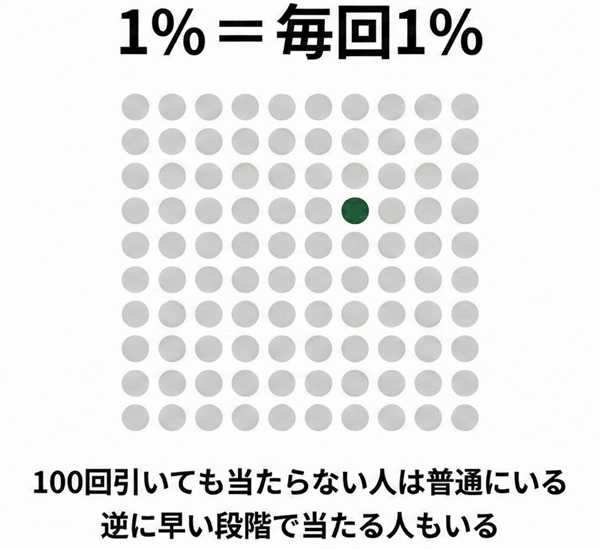- 当たり外れの偏りが起きると、体感で確率がおかしいと感じやすい
